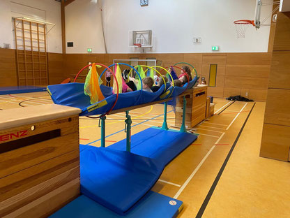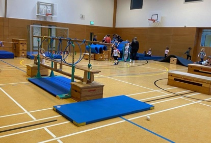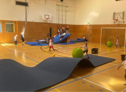 Turnen mit Geräten und in Bewegungslandschaften, Spiele, die das Miteinander in der Gruppe fördern, es sollen Grundfertigkeiten entwickelt werden, die später auch in anderen Sportarten benötigt